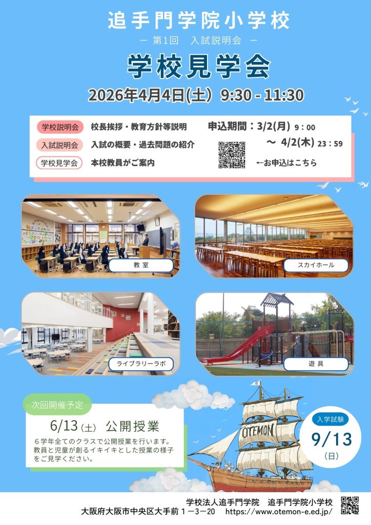 本校への入学をご検討されているご家庭(年長児・年中児・年少児)を対象に、教育方針や教育内容、行事等についてご説明いたします。138年間変わらずこの地で育む追手門教育の学び舎をぜひご覧ください。 なお、「学校見学会」は【事前申込制】です。この申し込みは、3月2日(月)9時から、こちらのサイト(miraicompass)で公開いたします。