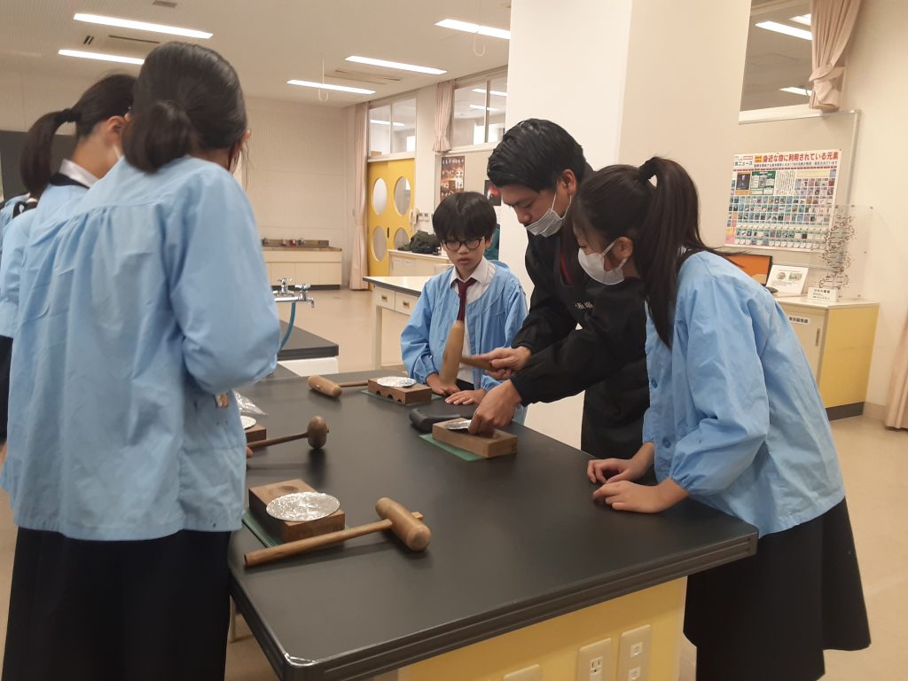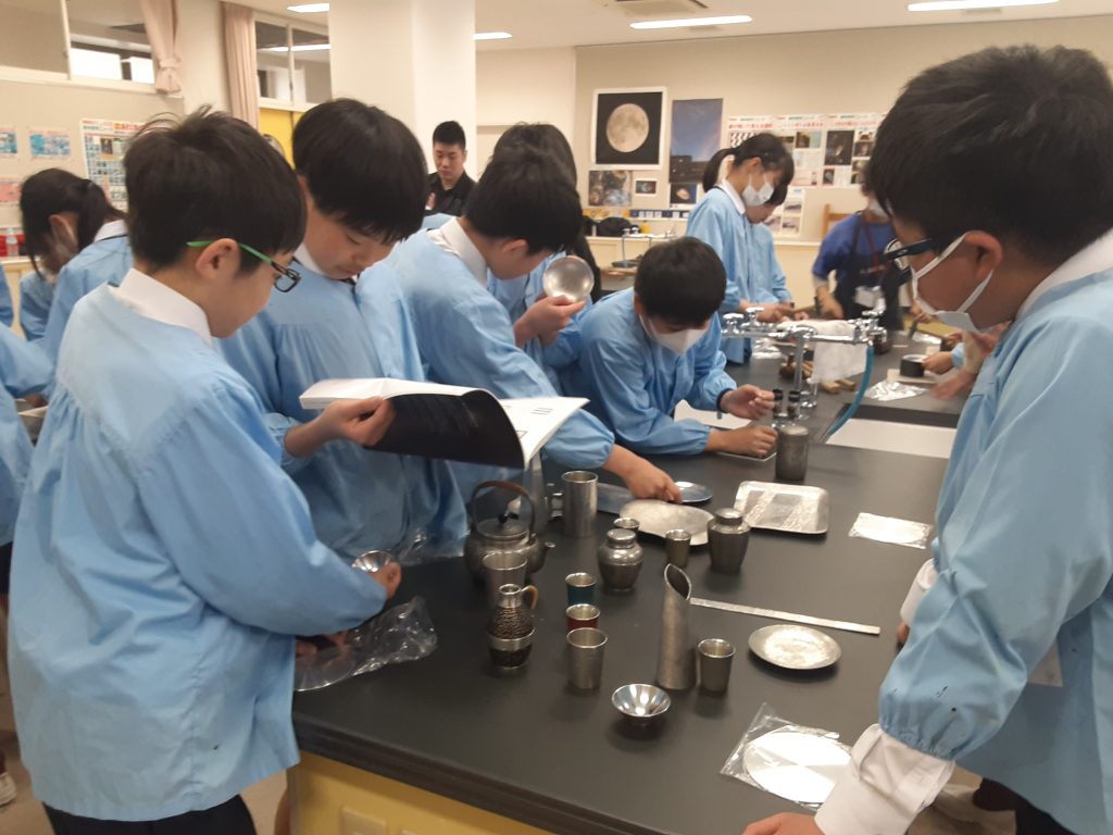 2月6日(金)、大阪錫器株式会社の代表取締役社長 今井氏をはじめ、錫器事業協同組合の皆様10名にご来校いただき、大阪錫器についての講演と制作体験を行いました。実際に体験することで、伝統工芸の素晴らしさを知り、より身近に感じることができました。