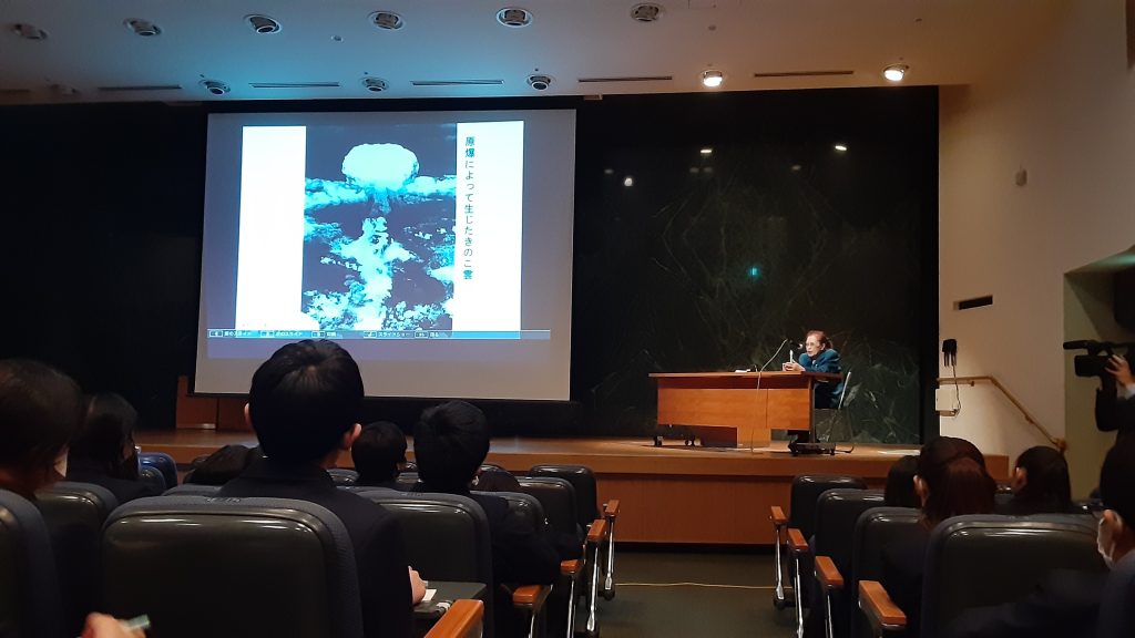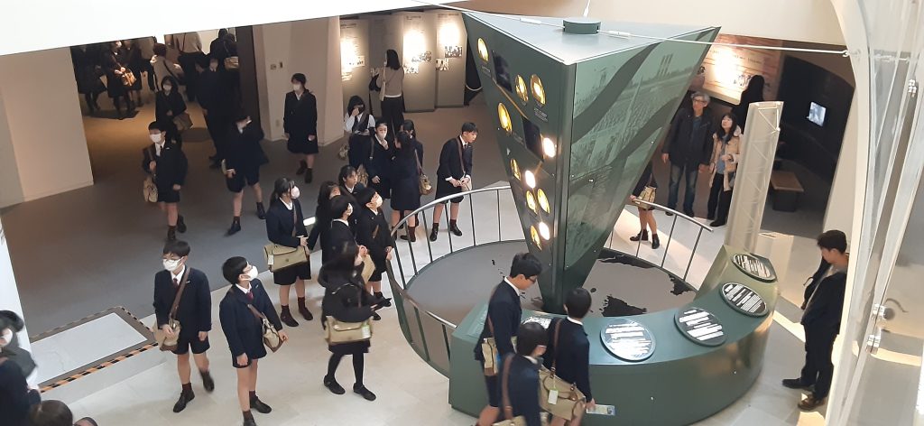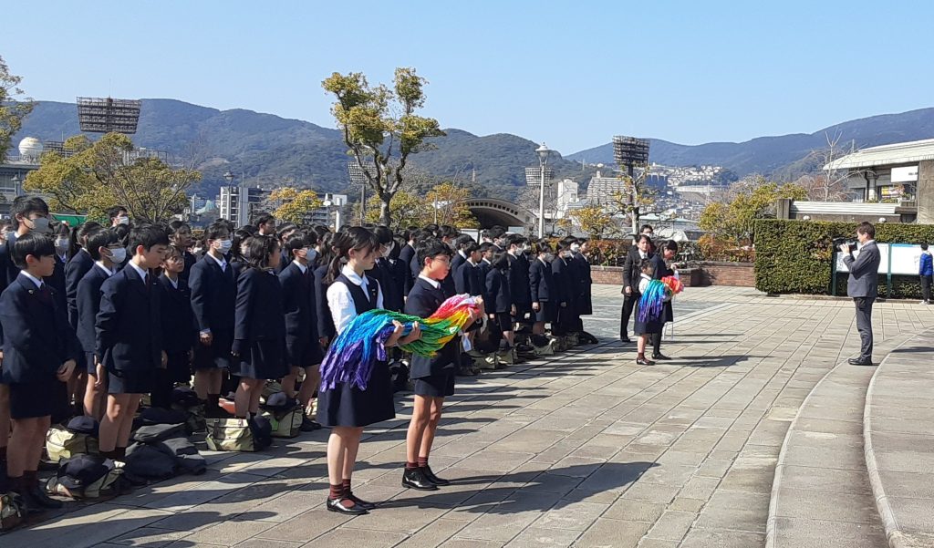 宿舎を出発した後、長崎原爆資料館に移動しました。子どもたちは、被爆後の町の様子を撮影した写真や熱線で溶解した被爆資料から戦争と核兵器の恐ろしさを学んだり、被爆体験の講和を真剣に聞いていました。また、平和記念公園では折り鶴の献納を行い、平和への祈りを捧げました。その後、昼食を食べ、それぞれの思い出を胸に帰路につきました。